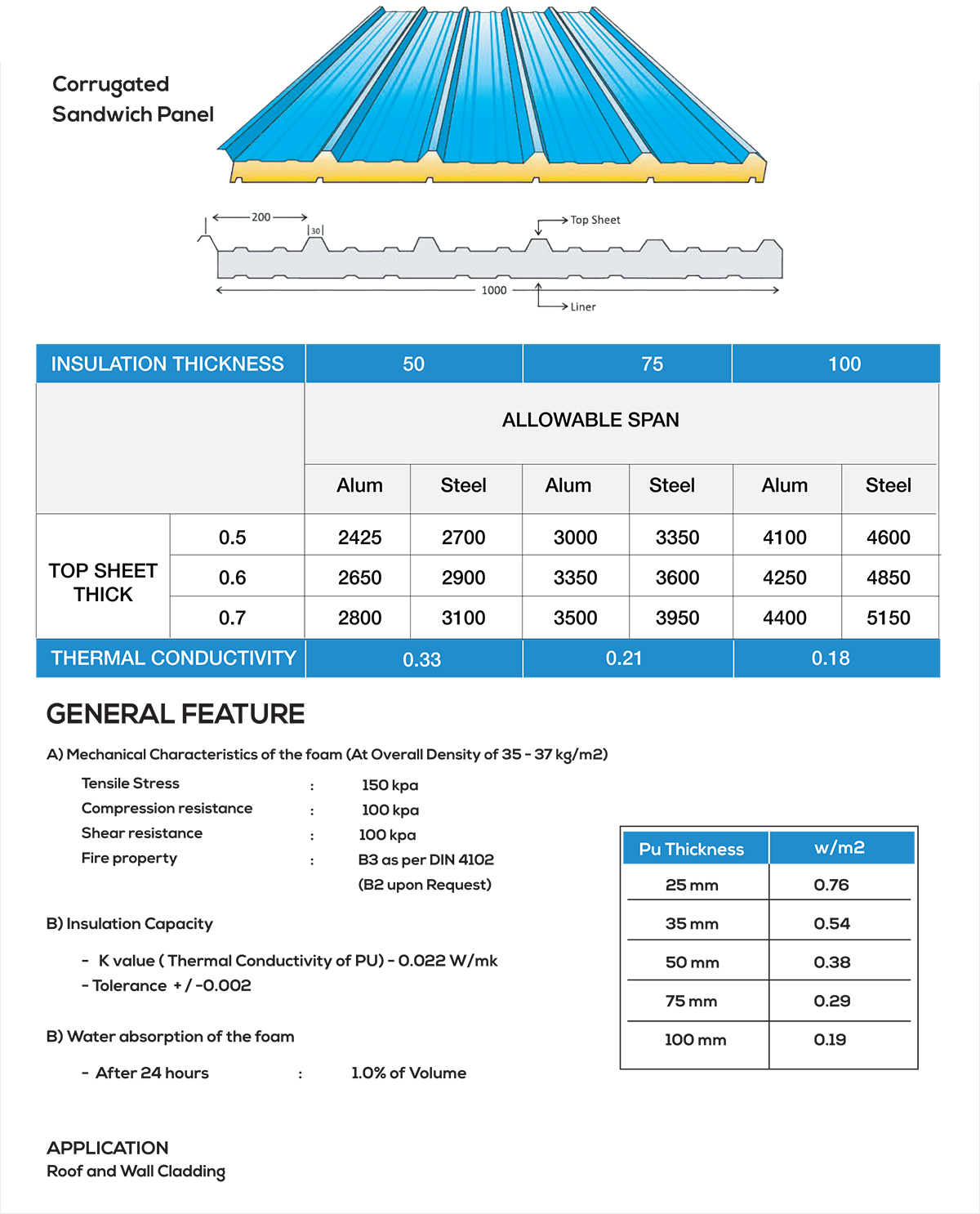 Profiled Sandwich panel: Thickness can be 35mm, 50mm,75mm and 100mm thick for corrugated roof and wall